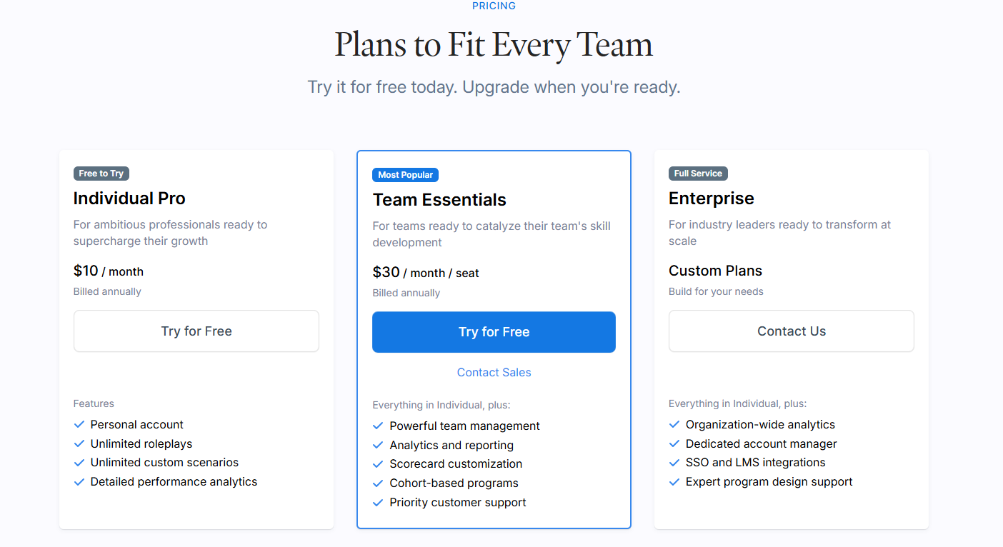 - The Individual Pro plan costs $10/month, billed annually, and includes unlimited roleplays with performance analytics.