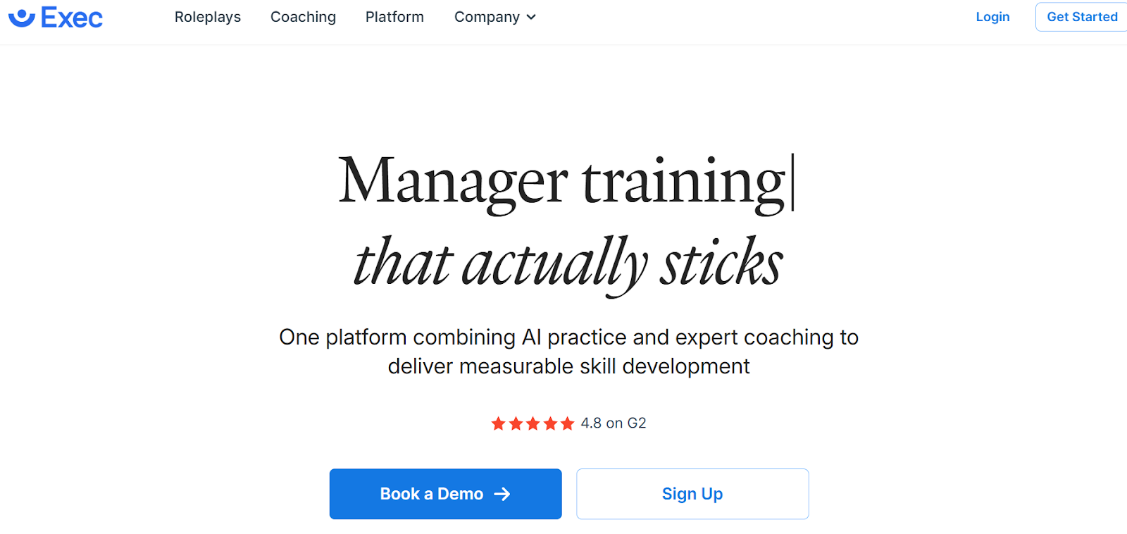 Exec is an AI + human hybrid coaching platform built to accelerate employee performance and leadership development. With the tagline “Talent development without tradeoffs”, Exec positions itself as a high-performance learning solution that blends AI roleplays, human expert coaching, and white-glove support.
