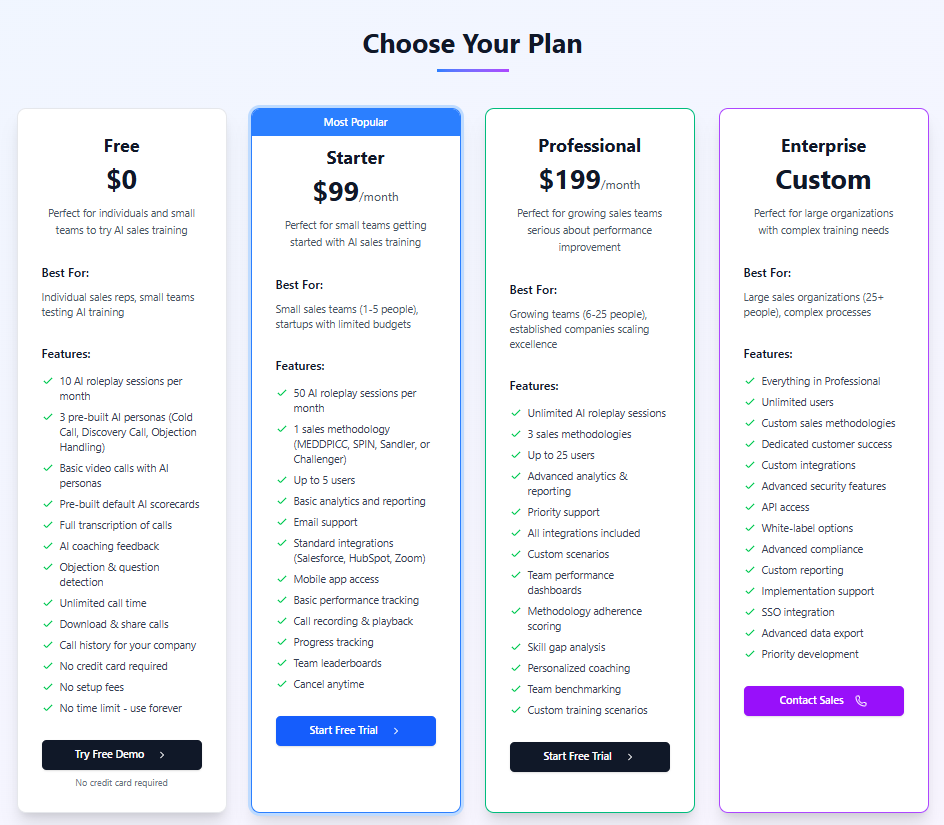 Unlike Quantified.ai pricing, which requires demos and custom quotes, SalesRoleplay.app posts clear rates for every plan. Every plan includes core roleplay features, predictable billing, and no hidden fees.
