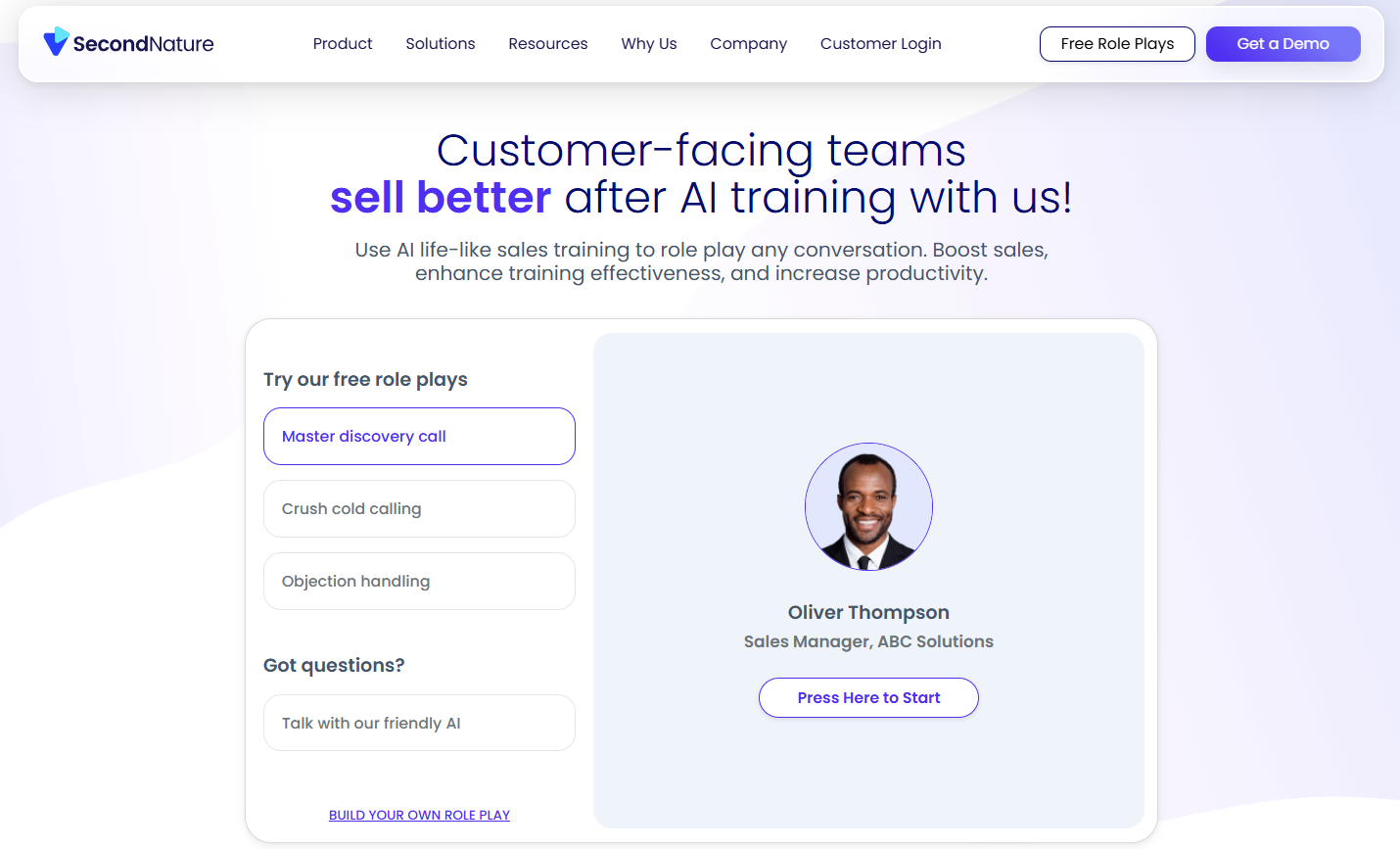 SecondNature.ai typically falls in the $30–$40 per user/month range, though pricing is hidden behind demo requests. Its standout feature is Jenny, a virtual AI customer that replicates realistic buyer conversations with objections and pushback. Combined with analytics dashboards and multilingual support, it’s positioned for mid-market to enterprise sales teams.