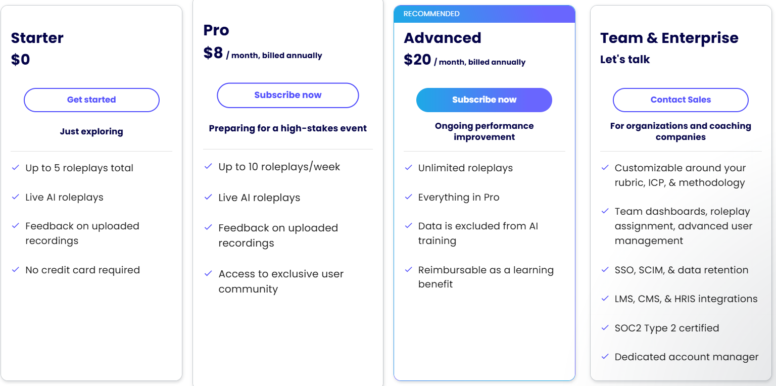 - Accessible pricing: Free plan with 5 roleplays, Pro at $8/month, and Advanced at $20/month with unlimited roleplays. Annual billing offers 40% savings, and the Advanced plan is reimbursable as a learning benefit.