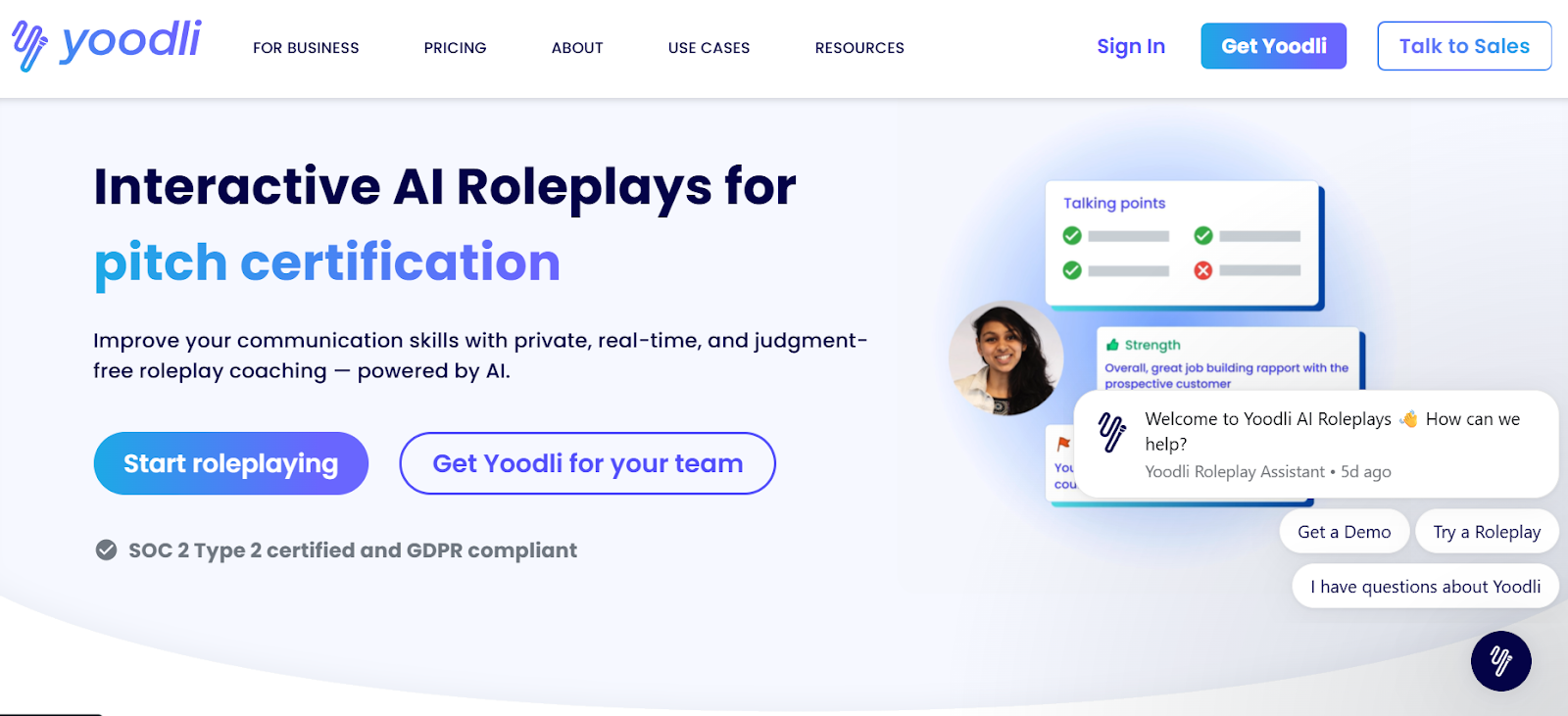 Yoodli’s core value proposition is private, real-time roleplay coaching with instant feedback. It operates in the AI-powered communication training platform category and is fully SOC 2 Type 2 certified and GDPR compliant. This makes it a secure choice for individuals and enterprise teams.